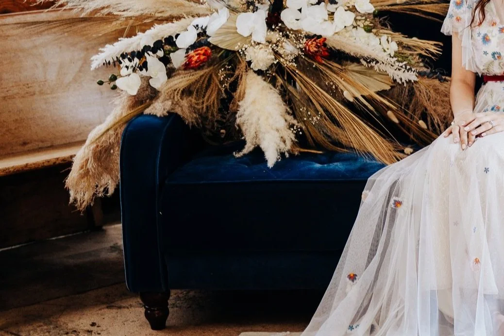 All my couches are named after the first bride I sent them out to on their wedding day! Isabella chose the Pick & Choose option and did her own setup shown with the suitcase and the wooden trifold. She did a beautiful job!
